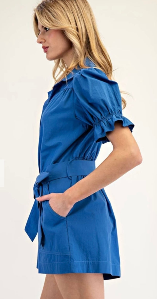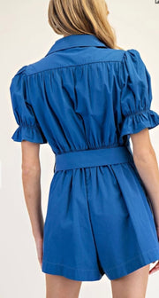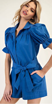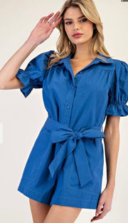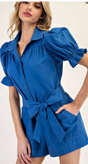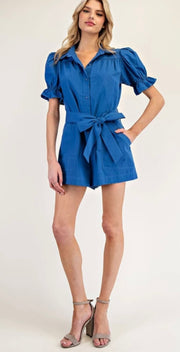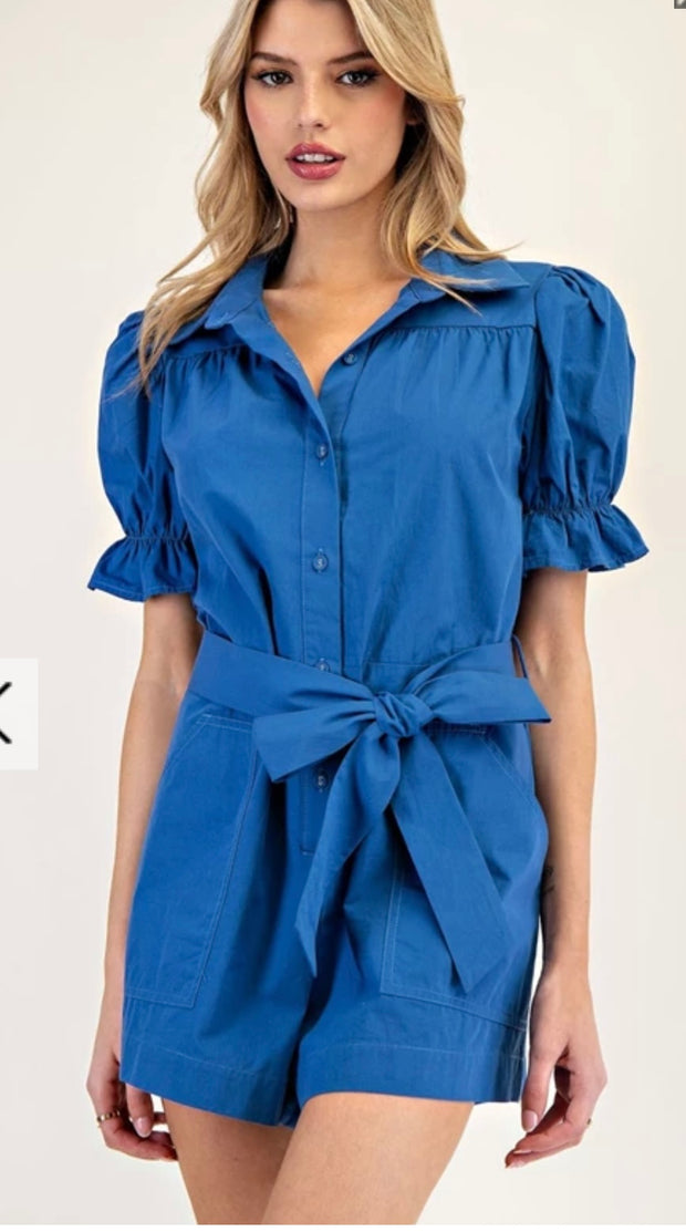 So light and cute! With the structured collar and fun puff sleeves this waist tie romper will have you ready for summer fun!