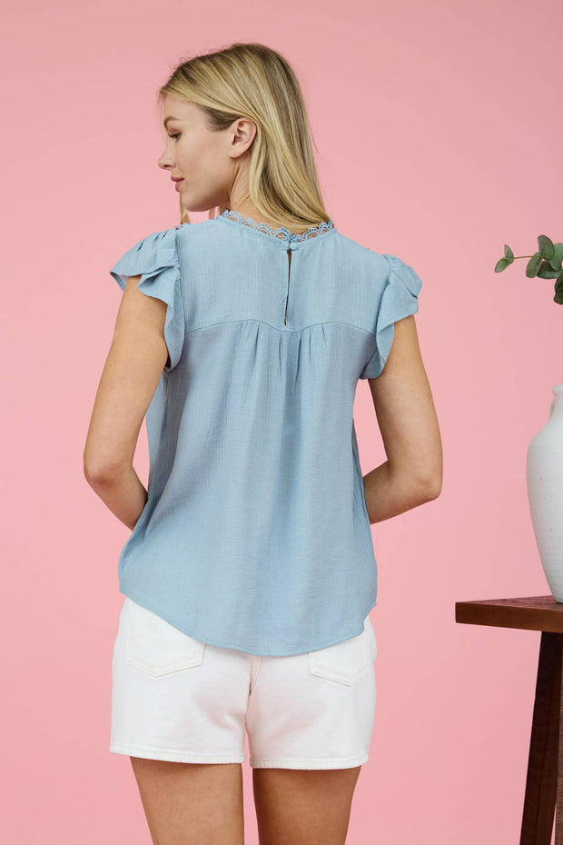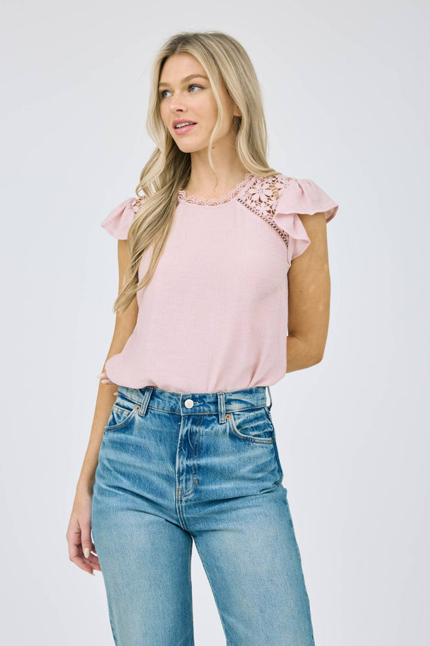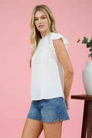 ROUND NECKLINE SCALLOP NECK TRIM BACK KEYHOLE CLOSURE SHOULDER PANEL LACE DETAIL SOLID NOT LINED LIGHTWEIGHT WOVEN TOP SELF: 87% RAYON, 13% NYLON CONTRAST: 100% POLYESTER