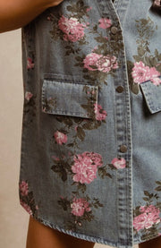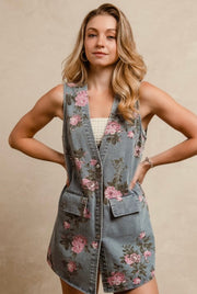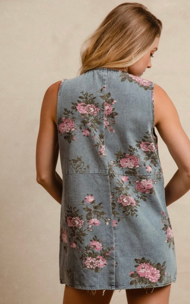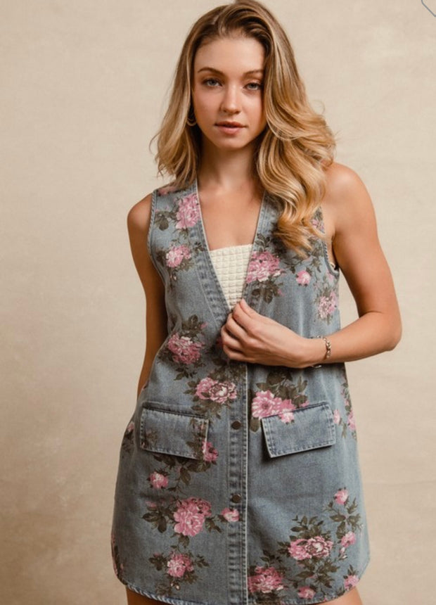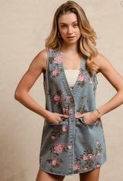 A longer length denim vest with gorgeous pink floral pattern. This vest is so cute work open, put it over jeans or pants or adorable with shorts! Wear it closed over leggings or pants and get ready for some compliments! Snap closure make it easy- two front pockets too!